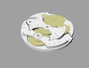 I set about measuring all of these components (getting good at this bit 🙂  ) and re-drawing them in a basic form in the computer, to rearrange their layout into the barrel shaped movement I had planned out earlier.